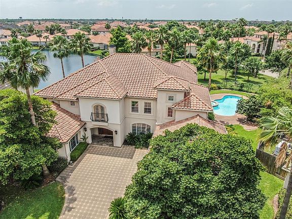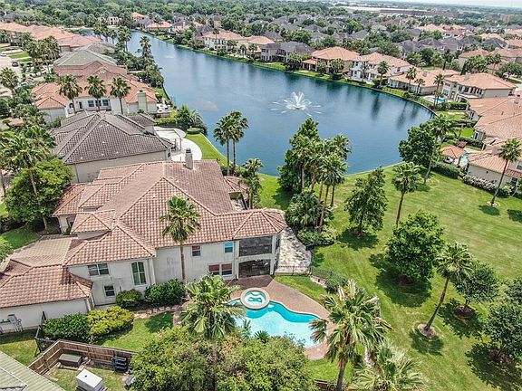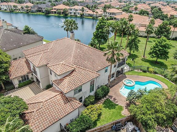 Welcome to this elegant haven in the much sought after Lakes of Parkway subdivision. This immaculate Kickerillo home offers a gorgeous open floor plan designed for entertaining, huge bedrooms, balconies and panoramic water views from many rooms in the house. Beautiful master bedroom and bath with custom closets. Well designed wood paneled office to work from home. Guest room with private balcony with beautiful sunset water views. Game room can also be used as media area. Secondary bedroom room has secondary attached study/office area. Home features large walk in closets, secondary living area upstairs, plantation blinds, extensive built ins for storage. Backyard offers private pool, tasteful landscaping opening into lush green open grounds. This lakefront home is close to walking trails, community tennis courts, and club house - one of the best locations in Lakes of Parkway. Manned entry. NEVER FLOODED.