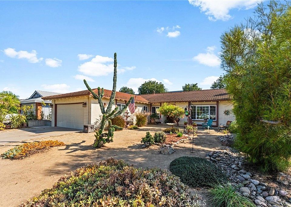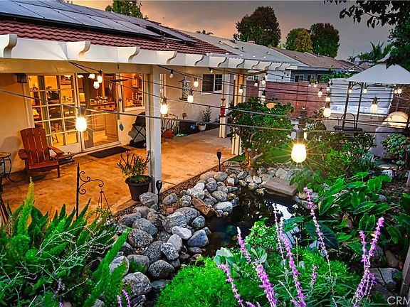 The front yard features drought-tolerant landscaping for easy maintenance and curb appeal, while the backyard is a private oasis with a large covered patio, peaceful koi pond, and an inviting above-ground spa — ideal for relaxing or entertaining.