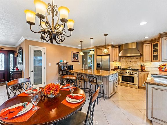 The heart of the home is the gourmet entertainer’s kitchen and adjoining dining area boasting granite countertops, custom cabinetry, a large center island, 6-burner gas stove, stylish backsplash, stainless steel appliances, a built-in hutch with wine cooler and a separate pantry.
