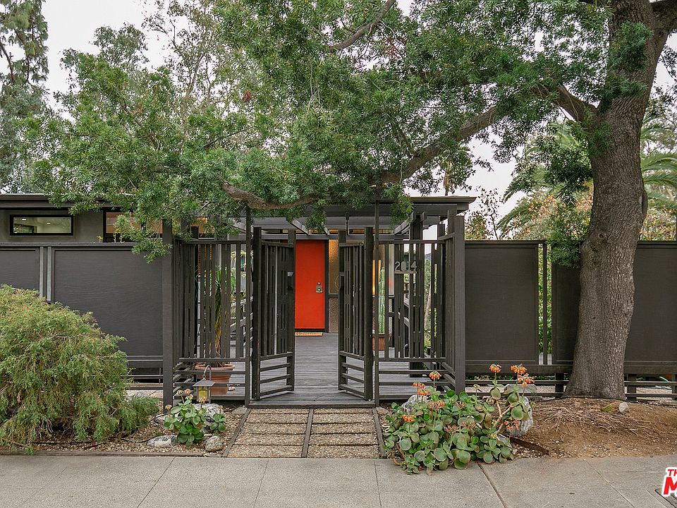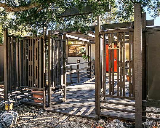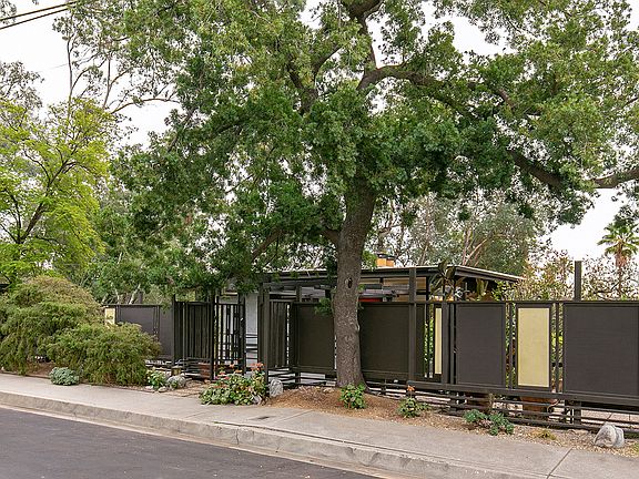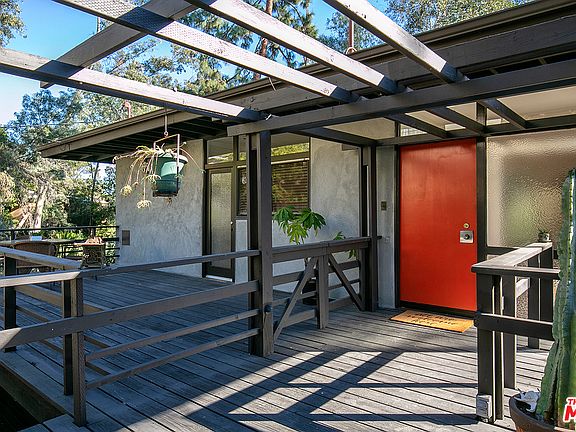 This Schindler-esque Zen midcentury modern has tree-top views from almost every window and decks everywhere--true California indoor/outdoor living. There are two bedrooms, a den, an office/3rd bedroom, and a dining room that looks out onto a soothing koi pond. Both baths have been freshly updated in midcentury-contemporary style. The large upstairs bath has a terrazzo floor, an open shower design, a free-standing tub, plus a custom vanity with soft close drawers. The living room & dining room both have gas fireplaces. There is a laundry room/pantry & a surprising amount of storage from the carport to the bottom of the 14,715 sq. ft. lot. The flooring is now real cork upstairs & marmoleum downstairs--period appropriate materials that are beautiful as well as tough. Tense? Soak in the spa outside and let the jets massage you mellow. This is the kind of serene, emotional setting that gives you a visceral feeling of joy and peace when you come home. One of the owners is the listing agent.