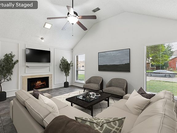 Cozy fireplaceOpen floor planLarge windowsRich granite countertopsSleek stainless steel appliancesSoaring ceilingsStone patio