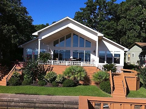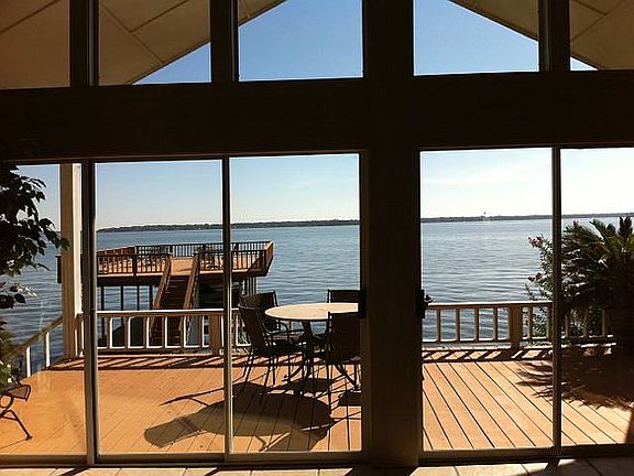 WHAT A VIEW! SOUTHEAST ORIENTATION WITH MILES OF OPEN WATER. SPACIOUS LIVING AREA, VAULTED CEILINGS, WALL OF WINDOWS, STONE FIREPLACE. WONDERFUL KITCHEN WITH LARGE EATING OR SERVING BAR. OWNERS SUITE AND ONE GUEST BEDROOM HAS WATER VIEWS. COVERED PORCH, BOATHOUSE WITH PARTY DECK.