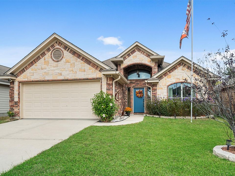 Welcome to 2014 Lost Pine Court in the Pinewood Forest neighborhood of Conroe. This well-maintained home offers quick access to Loop 336, 105, I-45, The Woodlands, and Lake Conroe. The upgraded stone-and-brick elevation and covered front porch create great curb appeal. Inside, the entry features high ceilings, a coat closet, and a huge storage closet - ideal for linens, pantry overflow, or flexible organization.. The dining room connects to the island kitchen with a breakfast bar, ample cabinets, travertine backsplash, and stainless appliances. The kitchen opens to the living room with a slate fireplace and custom mantle which create the perfect focal point for cozy gatherings. The backyard includes a covered patio, extended pavers, and no rear neighbors for added privacy. The primary suite has tall ceilings, a soaker tub, separate shower, dual sinks, and a linen closet. Two spacious secondary bedrooms and upgraded flooring throughout the main areas complete the home.