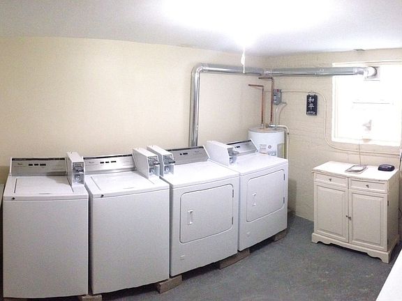Vintage brick buildingCoin-operated laundry in buildingStainless steel appliances