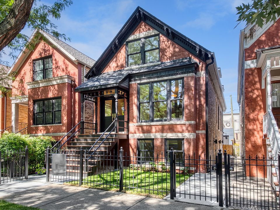 Fall in love with this absolutely stunning full (to the studs) renovation in 2023 of a historic 1895 worker's cottage in Chicago's Ukrainian Village. Incredibly charming and serene one way street lined with picturesque single family homes. No detail of quality spared from top to bottom and front to back on this home. All brick exterior, gorgeous restored historic awning, stylish outdoor lighting, and all IPE ( brazilian hardwood) stairs and decking. Landscaped and fully fenced front and back yard with cedar and iron. Brick paved walk way leads to the all new almost 2.5 car garage with alley access. Equipped with a 50 amp electric car charger. Roof deck-ready over garage ( plans can be drawn specific to buyer needs upon request.) Enter the home through a beautiful matte black and glass, double door. White oak wide plank floors, elegant baseboard and molding, and custom designed stair railing that fits the home perfectly. The front sitting room and foyer have the original lighting. Breathtaking original etched marble fireplace and mantle. Built in dry bar with wine refrigerator. Powder room perfectly located between kitchen and the formal sitting room on the main level. Kitchen with soft gray custom cabinets, quartz counters, ceramic backsplash, suspended glass and brass upper shelving, eat in island, and all Bosch stainless steel appliances. Obsess over the kitchen's attached walk in pantry. Dining room and two living spaces on the main level. At the rear of the home enjoy a wall to wall lited sliding glass door that leads to the backyard. Take the stairs down to the fully finished lower level and find two additional bedrooms, a full bathroom, an additional laundry room with a sink, a storage room, utility room, and a third family room. On the third level, flooded with light and skylights abound are two more bedrooms with an adjacent bathroom and the master suite. The master suite features a sitting room, a private side by side laundry with a pocket cabinet, a walk in closet, a marble master bathroom with a dual vanity, a light filled master bedroom with built in wall to wall dresser. Quality windows and doors in every room. Storage and closets everywhere. Tasteful designer lighting throughout. Tankless hot water heater with recirculation. CAT 6 wired network.