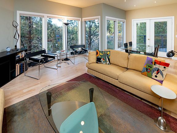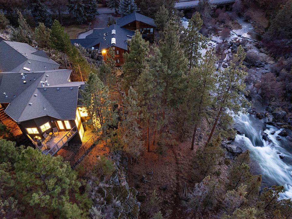 Nestled in the trees & overlooking the Deschutes River where you hear the sounds of rushing water from most rooms of this spectacular home. Great room has fireplace, built-in cabinets, 3/4'' hardwood floors and ''walls of glass'' taking in the vast views & beyond. Imagine cooking in your spacious kitchen with your granite counters, cabinets & drawers galore, center island with bar sink, breakfast bar, gas cooktop and similar views & sounds of the Deschutes River. Primary bedroom is on main level with fireplace, windows galore, jetted tub, radiant heated floors, dual vanities, walk-in shower & massive walk-in closet with built-ins. Downstairs has bonus room with hardwood floors, fireplace, wet bar, full bath off bonus, an en-suite bedroom with full bath, 3rd bedroom with doors leading to pavered deck. Enjoy outdoor entertaining on your private deck for a bbq and again the sounds of rushing water creating a serene environment. If you are looking for a sanctuary, look no more!
