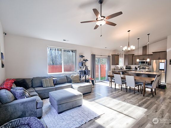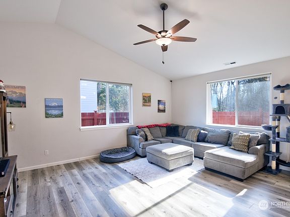 Like new, 2021 1848 square feet contemporary rambler. Open concept room layout with granite kitchen with eat-at island, dining & living areas. All Smart Samsung Appliances stay, including washer & dryer. Rooms are spacious & bright with vaulted ceilings, large windows & lots of storage. Bedrooms are split on opposite sides of the house providing privacy between the two secondary guest rooms & the primary suite. Large walk-in closet & 5-piece en suite complete the primary space. 4-piece guest bath. Fully fenced backyard with patio. Located at end of road in cul-de-sac. No active HOA & easy commute location. Five minutes from Grand Mound, Exit 88.