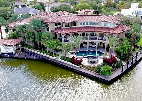 Experience Opulent Living with this stunning custom home situated on a premium corner, waterfront cul-de-sac lot with all the necessities for the Boating Enthusiast. Covered Boat House with Lift, Jet Ski Dock, and (2) Davit-Arms with 340 Ft. Bulkhead and 216 Ft. Dock. Enjoy the Resort Life with a refreshing cocktail at the Veranda Bar and Beverage Center or relax in the Negative-Edge Saltwater Pool and Hot Tub with LED remote controlled lighting. Inside you will be greeted to a 2-story Dramatic Entryway with staircase featuring porcelain tile and oak wood floors, or take the Elevator to your Dream Kitchen featuring Dual 30" Sub-Zero Refrigerators, Miele Coffee System, 48" Wolf Gas Double Oven-6 Burner Range and Griddle, Warming Drawer, Large Granite Island Counters with Seating, Storage Cabinets with pullout shelving and soft-close drawers. Entertain with Media Room, Wine Grotto, Game Room & SkyBar. Immerse in tranquil outdoor living on the expansive balcony with Sanctuary Views.