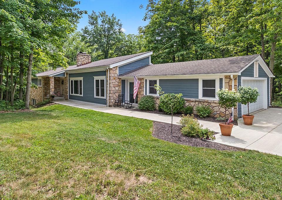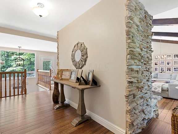 Over 4,000 SF of living space on 2.26 acres! Stunning updated ranch--private + peaceful yet close to all Powell has to offer. Open layout living space has large great room w a beautiful stone fireplace connecting to the dining room. Updated eat-in kitchen with stainless appliances, granite counters. Enclosed breezeway between garage and home allows for mudroom/great storage. Convenient first floor laundry. Master bedroom has large WIC, beautiful bath, and private balcony. Full walkout lower level contains large living/family room + fireplace, mother in law suite, full bath, second laundry room, kitchenette and rec/workout area. Newer windows, furnace, AC and hot water tank (all installed 2015). Natural gas, Del Co water + septic. A must see!