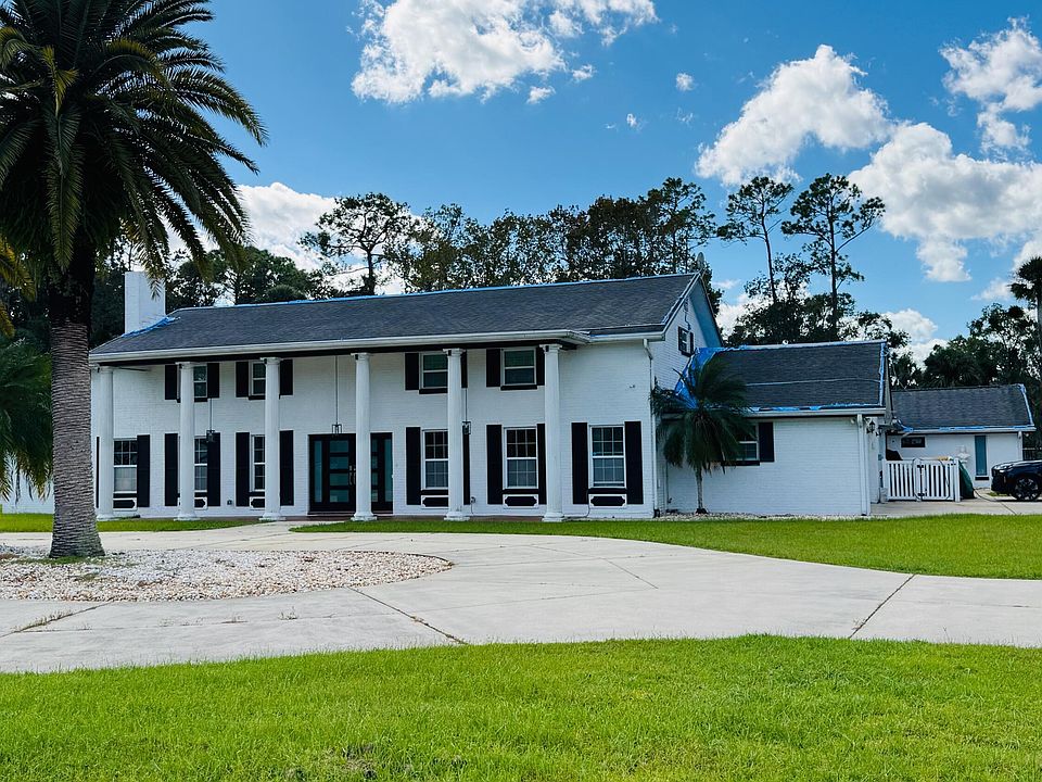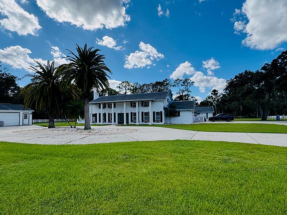 Beautiful home on nearly 5 acres, now about 95 percent through a major remodel. Features a huge screened pool area—approx. 3,500 sq ft under enclosure—with bar and colorful wall art by a well-known local artist. The 22x44 ft pool is a true centerpiece, perfect for entertaining. Enjoy a resurfaced tennis court (2023) and a racquetball court ready for a refresh. Inside, two master suites—one upstairs and one down—each with ensuite baths and dual walk-ins. The 1st-floor master spans roughly 1,500 sq ft, with an office and folding glass doors that open to the pool area for seamless indoor-outdoor living. A newer detached 3+ car garage and double integral garage offer ample space. New perimeter fencing encloses the property's mature trees and manicured lawns. Some water intrusion occurred during the last hurricane, reflected in pricing, with plenty of land for future drainage options.