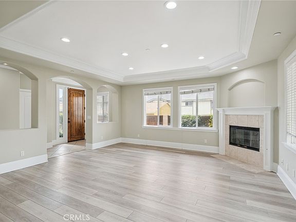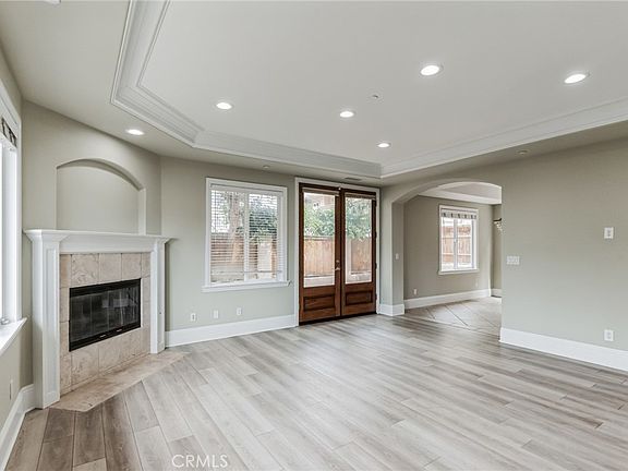 The gourmet kitchen is a chef's dream, featuring custom cabinetry, a pantry for ample storage, sleek stone countertops, and top-of-the-line stainless steel appliances. The spacious living room is a bright and open space, bathed in natural light. Crown molding adds an extra touch of elegance, while the Travertine fireplace creates a warm and inviting atmosphere. Outside, a private backyard awaits, offering a serene retreat for outdoor entertaining or peaceful relaxation. With a two-car attached garage, parking is a breeze, providing convenience and security.