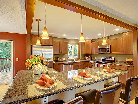 This is the one you've been waiting on! Beautifully remodeled open kitchen with slab granite, stainless appliances, and updated cabinetry opens up to great room with sweeping hardwoods and dining area leading to huge deck for summertime BBQs! Lower floor has a phenomenal rec/bonus room perfect for game days and movie nights! Extra deep 2 car garage with plenty of room for storage. Huge lot with play area and hot tub. Walk to Jackson Park and to the brand new Olympic Hills Elementary coming soon!