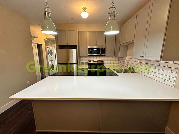 * Kitchen features quartz counters, stainless steel appliances, including dishwasher and microwave oven