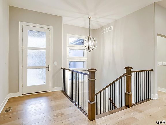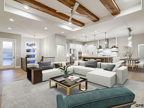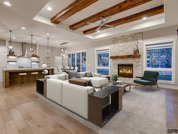 Welcome to this stunning transitional & timeless home! The attention to detail and design choices are impeccable. Spacious & open floorplan w/ 10' ceilings, oversized windows, and European oak flooring. The great room features a floor-to-ceiling stone fireplace and custom wood beams reclaimed from Downtown Old Market. Fabulous kitchen with huge pantry, gas cooktop, large center island and French sliding glass doors leading to the covered patio. Three bedrooms on the main with walk-in closets and bath access. Elegant primary suite with wet room & large walk-in closet that connects to the laundry room. Convenient office nook behind kitchen. Drop zone off garage and private guest powder bath. The lower level features a 4th bedroom, wet bar, home theater, pocket door to hidden room, and enormous storage area. Sideload garage and circular drive. Exceptional oversized garage with new Epoxy flooring. Tons of trees in backyard for privacy. Fresh neutral paint. Welcome Home!