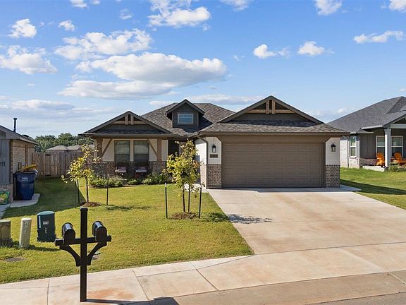 Built in 2024, this stunning, move-in ready home offers modern style and thoughtful design in the highly sought-after Park Valley Edition and Sangre Ridge Elementary, just minutes from OSU. Step inside to find real wood floors flowing throughout the main living areas, complemented by soaring ceilings and a wide entry hall that leads you into a sunlit living space. Tall windows frame the room, drawing in natural light and highlighting the home's upscale finishes. The heart of the home is the spacious kitchen, where earthy green cabinets pair beautifully with quartz countertops, a large island, and stainless steel appliances. Elegant black and gold light fixtures add a touch of luxury throughout the home. Enjoy a smart split-bedroom floorplan, providing privacy in the primary suite which features a tiled shower and modern finishes. The secondary bath includes a chic tiled surround. Additional highlights include a separate laundry room, mud bench off the garage, and a nice-sized fenced backyard complete with a covered patio—perfect for relaxing or entertaining year-round. This home is ready to welcome you with timeless design, thoughtful details, and a location you’ll love.