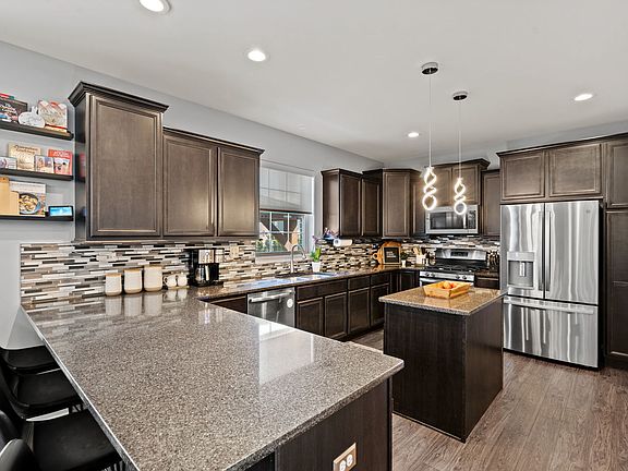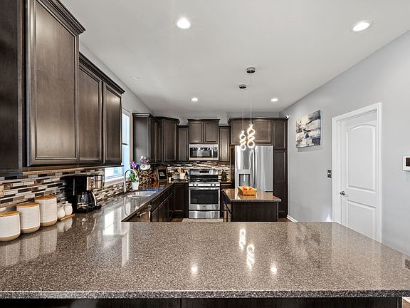This spacious Newbridge model boasts the largest lot in Bristol Park, offering a fully fenced backyard and a heated 3-car garage with epoxy flooring. Inside, enjoy a luxurious main floor with eat-in kitchen, walk in pantry closet, island with breakfast bar, gleaming quartz countertops, top-of-the-line stainless steel appliances, and a stylish tile backsplash, formal dining room with custom wainscoting, separate living room, spacious family room, main floor laundry, primary bedroom has tray ceiling, walk-in closet and luxury bath, additional bedrooms are all generously sized, huge loft, full basement with rough in plumbing for future bathroom. Enjoy outdoor living from the impressive 42x33 concrete stamped patio, natural gas fire pit, custom lighting and seating, sprinkler system and more. Don't miss this opportunity to live large in luxurious style!
