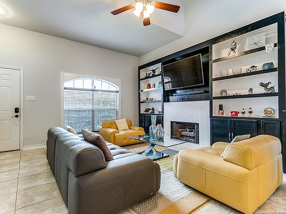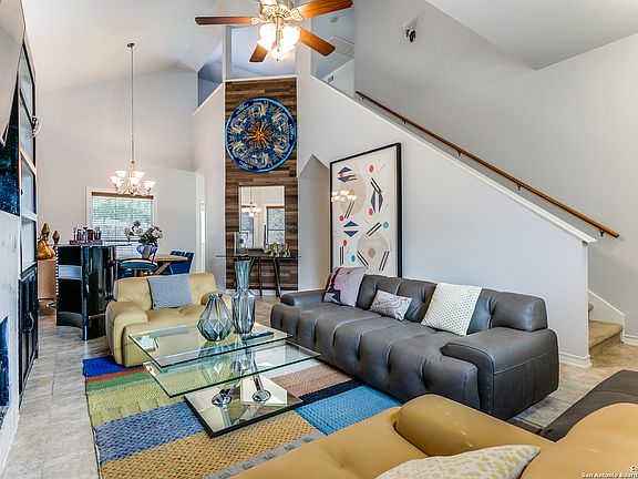 Fantastic location near Wurzbach Parkway, Hwy 281, the airport, library, and HEB! Just steps away from your private entrance to McAllister Park, where you can enjoy bike trails, playgrounds, soccer fields, and a dog park. This truly well-maintained home sits on a desirable 0.15-acre corner lot in a gated community with controlled access, offering both curb appeal and peace of mind. Inside, you'll be greeted by soaring 20-ft vaulted ceilings and a custom shiplap feature wall that fills the living and dining areas with natural light. The large eat-in kitchen is perfect for gatherings, offering granite countertops, pantry, stainless steel farmhouse sink, and a double-oven stove range. A convenient powder bath is located just across the kitchen. The owner's suite on the main level provides privacy and style with a spacious layout and a wainscoting accent wall. The luxurious bath features a double granite vanity, garden tub, and walk-in shower. Upstairs, a flexible loft offers room for a second living space, home office, or playroom. The secondary bedrooms are generously sized, and the guest bath enjoys natural light from a tempered glass window. Step outside to a large backyard retreat with a flagstone patio, extended slab, and a variety of fruit trees including pecan, peach, and fig. Best of all, fully paid-off solar panels, giving you immediate savings on your electric bills and eco-friendly living without the burden of a loan or lease. Come see this unique home and fall in love with the perfect balance of comfort, efficiency, and location!