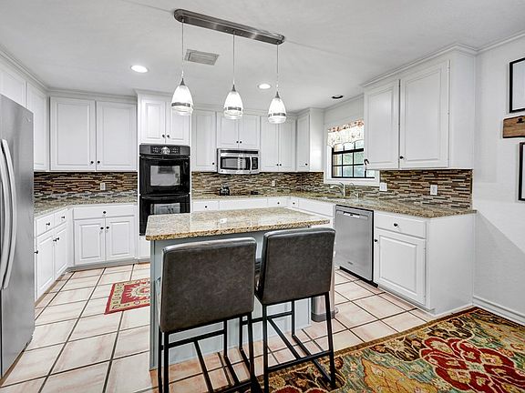 Gas log fireplaceGranite countersSpacious backyard with patioSpacious kitchenRich wood panelingCenter islandWhite cabinetry