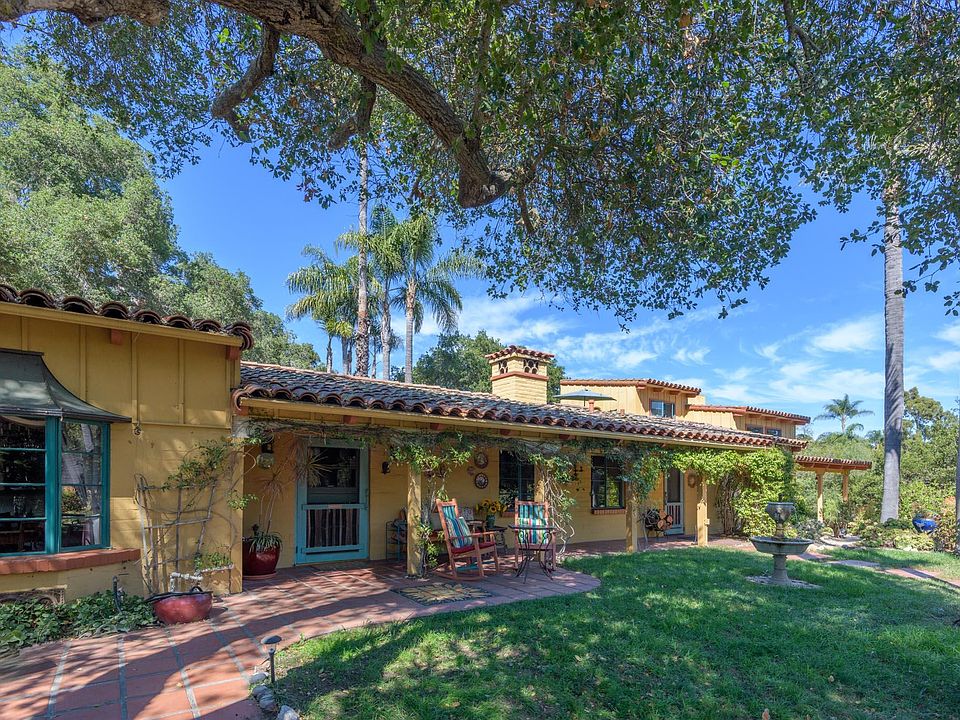 Welcome to Skye Oak, a vintage, one-of-a-kind home tucked away in historic Mission Canyon—just minutes from downtown Santa Barbara. Skye Oak is a soulful sanctuary surrounded by 1.66 acres of nature at its finest. A long private drive set back off Foothill Road winds uphill past birds of paradise and sentinel palms, arriving at a serene setting framed by mature oaks. Architecturally, the home blends early California adobe style with later additions. The main home 3b/2.5ba + an office features Spanish tile floors, steel casement windows, and a light-filled parlor anchored with a small library extension and a raised-hearth fireplace, the heart of the home and a natural gathering space. Down the hall, a spacious den added in 1985 offers soaring ceilings, pine finishes, hardwood floors, and a dramatic river-stone fireplace. A separate dining room, converted from the original garage, is an intimate atmosphere ideal for candlelit dinners and celebrations. The main home also offers a large primary bedroom with a private viewing deck and ensuite bath, an upstairs office, and artist-designed murals. A charming 1b/1ba 700 square foot casita provides additional living space, featuring a cozy log-cabin interior and a striking floor-to-ceiling stone fireplace. The grounds are equally spectacular, with multiple sitting areas that offer canyon views, outdoor dining areas, along with a stone firepit area for evenings under the stars. The property also includes a detached three-car garage and equestrian amenities, with easy access to nearby riding trails and neighborhood parks. Offered for the first time in 46 years, Skye Oak has been deeply loved and thoughtfully lived in, ready for its next chapter.