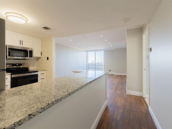 Experience high-rise living in this IMMEDIATELY AVAILABLE, beautifully maintained 1BR residence on the 20th floor, featuring south-facing views of the Texas Medical Center and two private balconies perfect for enjoying sunsets! This light-filled home showcases: Wood-look flooring throughout, bedroom with its own bath; brand-new kitchen (2024) with modern finishes, and updated bathroom (2024). Rent includes: All utilities including internet, making life simple and stress-free and mid-town living affordable and attainable. The buildings amenities include: 24/7 manned entry for peace of mind, the recently updated, open year-round pool with sundeck and covered bbq area, updated fitness center, use of the community lounge and banquet room, and 1 reserved parking space and private storage cage. Enjoy a walkable lifestyle just steps from Downtown Houston's food halls, arts, and entertainment, as well as all that Midtown has to off