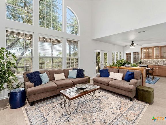 This exquisite 2,793 sq. ft., four-bedroom home in the Estates of San Marcos sits on a serene 1.12-acre lot with stunning oak trees and sunset views of the Texas Hill Country. Built in the classic Hill Country limestone style, the home includes a 17-foot wall of windows in the living room, a floor-to-ceiling limestone hearth with a wood-burning stove, and custom built-ins. The living room is open to the dining area, which features a dry bar and wine fridge—perfect for entertaining. The primary suite is located downstairs and includes a walk-in closet, separate vanities, a jetted tub, and a walk-in shower. Upstairs, you’ll find an additional living space, three bedrooms, and a bathroom, all open to the main floor. The recently refinished back deck offers a pergola and a screened-in hot tub room, where you can relax and enjoy the expansive Hill Country views. The property even extends beyond the back gate for added privacy and space. With an oversized garage that includes a workspace and water softener loop, this home combines comfort with practicality. Tucked quietly into the hills, the neighborhood offers a peaceful retreat while being just minutes from I-35, with easy access to the Austin/San Antonio Corridor. Texas State University, downtown San Marcos, shopping, and dining are all just a short drive away. Take a look at the tour link for additional information. Schedule your showing today!