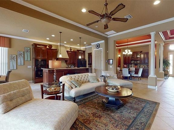 This beautiful home is even more beautiful with newly painted White Ceilings throughout...see a couple of the pictures to view. Dream of a home that has it all and has carefree living, it's this beautiful Model Home sitting on a lush corner homesite. Home has gorgeous appointments, such as double tray ceilings with crown molding, matching side panels to the Cherry Cabinets, beautiful Granite Counters in your Gourmet Kitchen, Baths and Laundry. Tile on the diagonal with tile inserts to separate each room, lots of cabinets in the Kitchen, Great Room, Dining Room and bathrooms..so beautiful to look at. Huge walk-in closets in Master and ample storage throughout. How about enjoying your beautiful pavered Lanai and 25 x 40 kidney pool with screen enclosure while relaxing in your private lush landscaping. Sit in your nook, enjoying the panoramic view with your large fused windows. See the window treatments, so classy, as you relax knowing you made the right choice to live the way you want in your resort style community, playing golf, tennis, dancing at the Tiki Bar, fitness, restaurants, walking, its all yours!