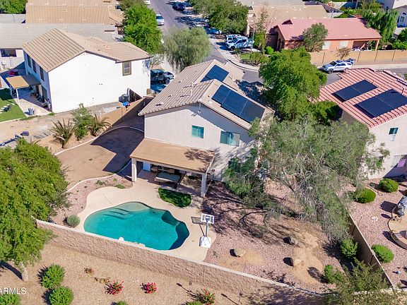 Former model home offering space, comfort, and endless potential. This well-designed home features 4 bedrooms, 3 full baths, and generous closet space in three of the bedrooms. Large windows with plantation shutters fill the home with natural light, complemented by beautiful tile flooring in the main living areas and carpet in the right places. A staircase with Brazilian cherry-style railing leads to an open loft; perfect as a playroom, home office, or media space. The kitchen is finished with granite countertops and ample cabinetry, creating a great flow for entertaining. Step outside to the covered patio overlooking a fenced-in pool and a large backyard. with RV Gate ready for your personal touch. Located in a desirable neighborhood close to shopping, dining, and entertainment, enjoy quick access to restaurants, local parks, and nearby schools. The home also features solar panels, helping reduce energy costs year-round.