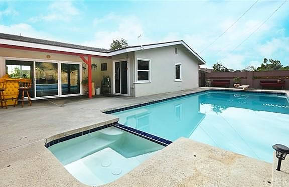 You will love this open concept floor plan and lots of windows for a "Light & Bright" feeling through-out. This home has 3 bedrooms and 2 bathrooms, the family room is open to the dining room and kitchen with a breakfast bar. A large pool, hot tub, fire pit and covered patio in the rear yard. The exterior was recently painted and re-done stucco, newer gunite in pool. Recently re-done concrete driveway, newer forced air/heat. Newer dual pane windows and slider along with the Primary on-suite bathroom remodel.