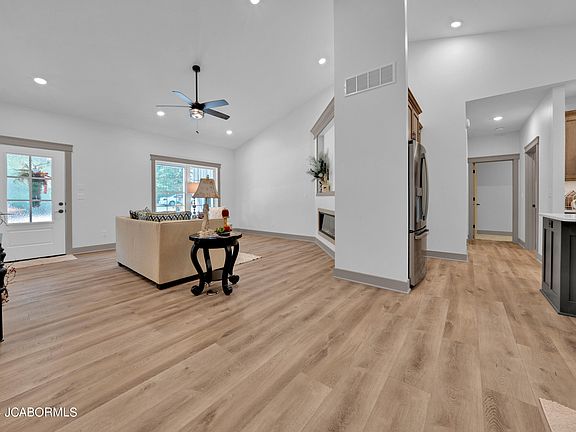 The kitchen is a chef's delight, boasting custom cabinetry, top-of-the-line appliances, a generous pantry, granite countertops, and a central island. The open and split bedroom floor plan enhances both functionality and privacy, and the luxury vinyl plank flooring, vaulted ceilings, and custom trim throughout add a touch of sophistication.