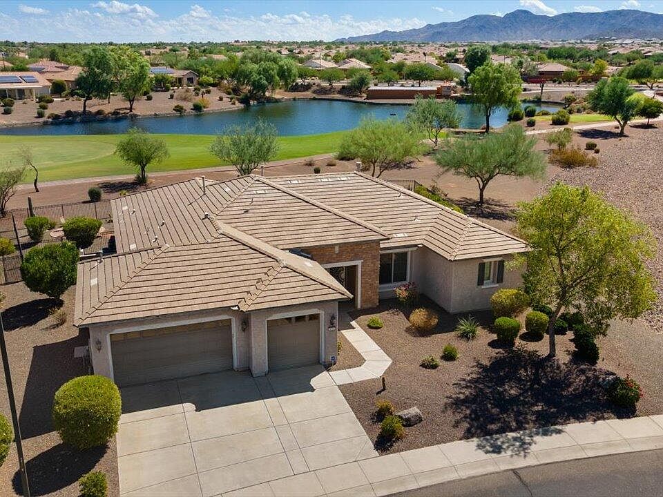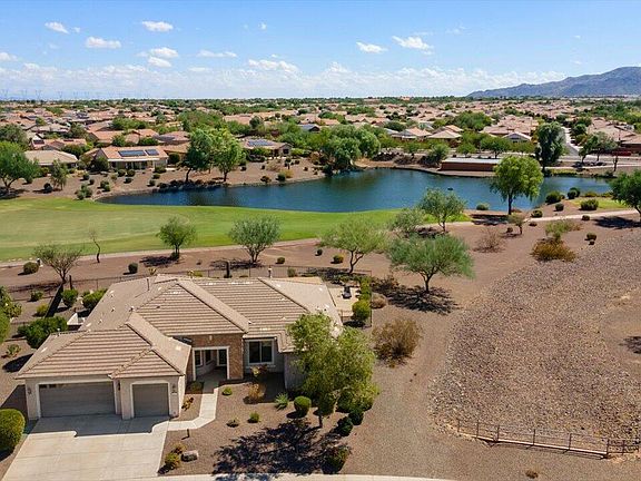 This is a very unique property in Sun City Festival, a 55+ active adult community with incomparable amenities! This 3-bed, 2.5 bath home features a formal dining area and a billiards room. AND the list price includes ALL furnishings. The best part is the east-facing backyard, nestled against the 5th hole on the Vista course, with a lake, fountain and mountain views! This oasis-like setting includes a pool with a heater and cooler and in-ground firepit, all perfect for entertaining. The spacious kitchen includes SS appliances and a gas cooktop. The master suite features dual vanities, shower and tub. The full-size 3-car garage includes built-in cabinets. Other special features include a Bose sound system, Brinks security, in-house vac and a new 2023 AC unit. This home is a MUST see!