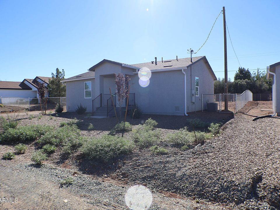 LARGE Builder incentive package offering extremely low, below market financing and/or temporary rate buydowns through preferred lender, coupled with $500 move in with ZERO Down payment on qualified applicants. USDA eligible. Brand New construction, site built, offering 3 bedrooms, 2 bathrooms, a covered back patio, and beautiful views. Great weather. Water is provided by Liberty Water- on septic. The property is conveniently located near Prescott Valley, Flagstaff, Anthem, and Phoenix, Arizona. If you're looking for affordability, this is it! Enjoy the cooler weather & seasons, nice-sized lot. Plenty of room for parking, no HOA. Stucco exterior. Fenced back yard- 5' chain-link fencing with drive-through gate.