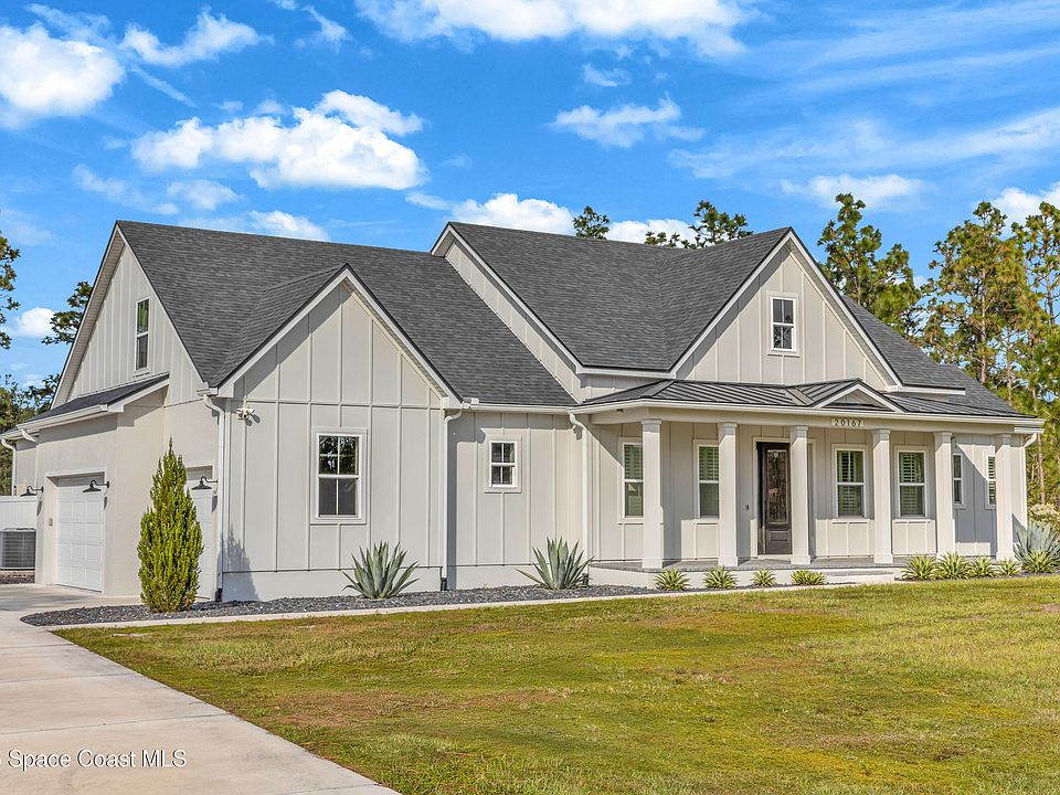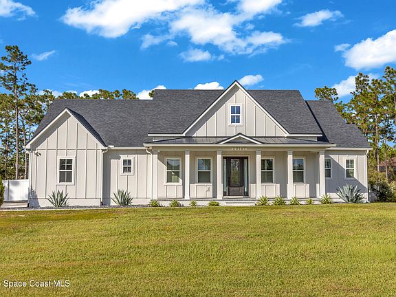 Experience luxurious country living in this custom farmhouse estate set on 1.24 acres of beautifully manicured grounds. A grand front patio with stately columns and paver walkways leads into a bright entry showcasing exceptional craftsmanship. A custom office with glass French doors sits beside a chic half bath and spacious closet. The open living area flows into a gourmet kitchen with quartz countertops, raised-panel cabinetry, a custom range hood, marble backsplash, and built-in KitchenAid appliances, complemented by an oversized pantry and elegant dinette. Two guest suites with private baths and walk-in closets sit on one side of the home, along with a generous laundry room. Upstairs, a loft suite offers its own full bath and storage. The luxurious primary suite features pool access and a spa-inspired bath. Outside, a screened retreat offers a fireplace, pool, spa, fire pit area, fenced grounds, outdoor shower, whole-home generator, and a three-car garage.