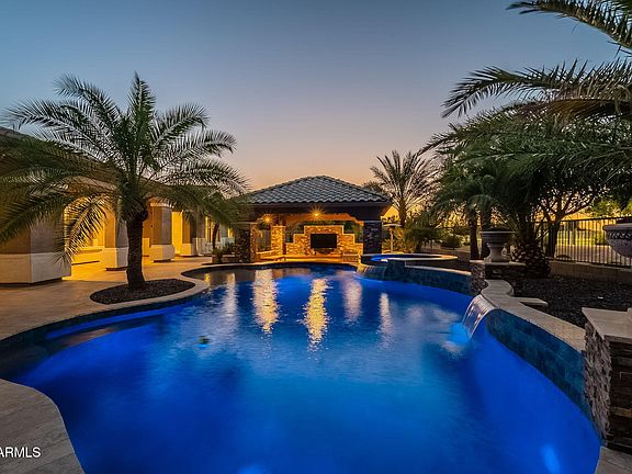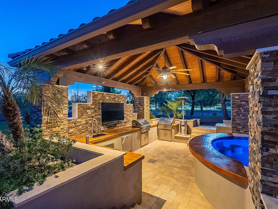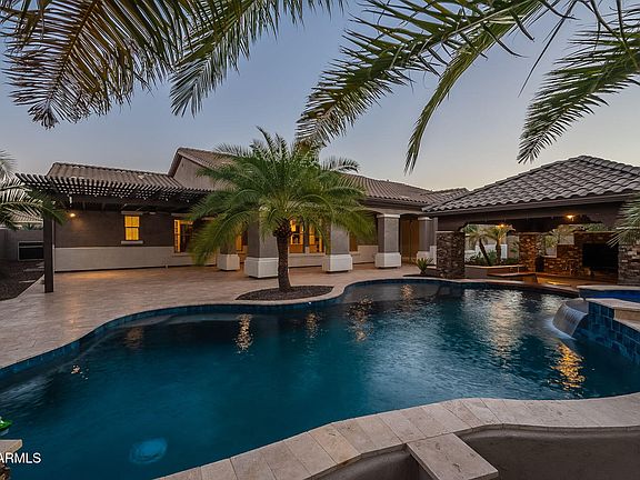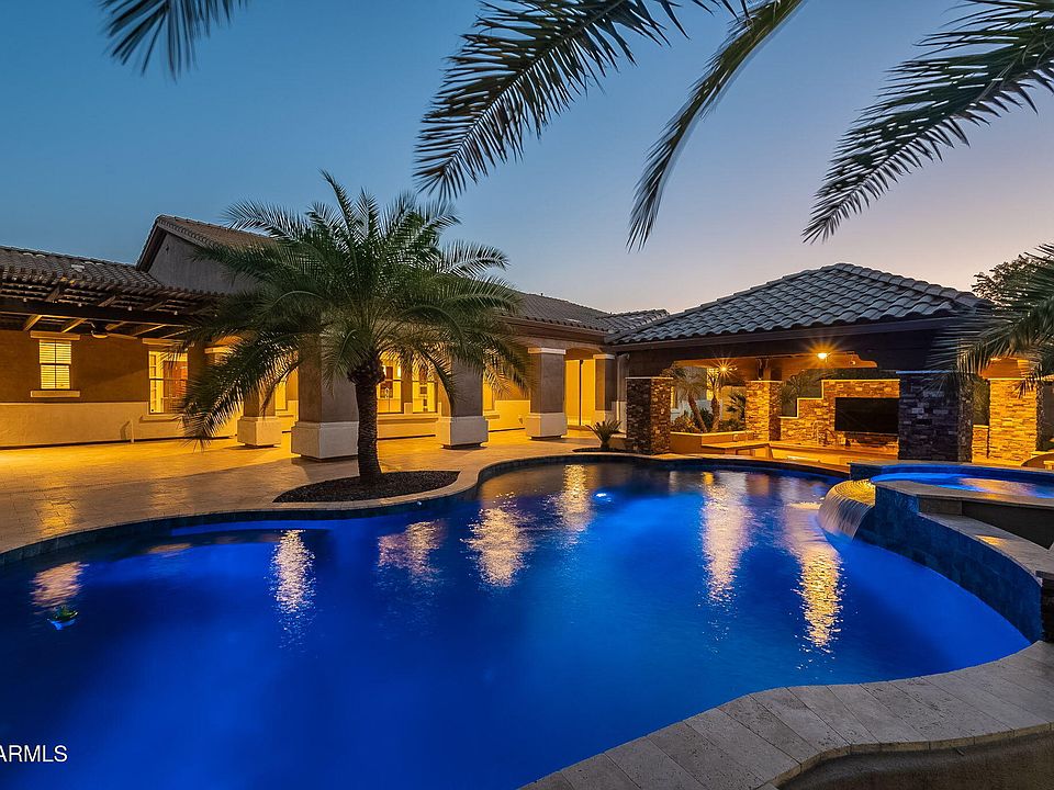 Welcome to your dream home in Montelena! This expansive 6-bedroom + office/den, OVERSIZED 4 car garage, 4,861 sqft estate offers space, style, and resort-style amenities—all situated on a 14,000 sqft lot with *NO REAR NEIGHBORS* Inside, enjoy a thoughtfully designed split floor plan with a large primary suite, Jack-and-Jill bedrooms, PLUS a finished basement featuring 2 additional bedrooms, a full bath, and gym. The kitchen is built for entertaining, with granite counters, stainless steel appliances, a butler's pantry, a dedicated prep kitchen, and a large walk-in pantry for seamless organization. Step outside to a true desert oasis with a heated and cooled smart pool featuring app-controlled lighting, cleaning modes, water features, (see more) and temperature settings. Enjoy the swim-up bar with stools, Baja ledge, spillover spa, and two natural gas fire pots for added ambiance. The custom Ramada includes a full outdoor kitchen with gas grill, standard grill, keg fridge with tap, second fridge with dual regulators, and ambient lighting. Travertine decking, a commercial-grade misting system, and lush professional landscaping complete the backyard retreat.