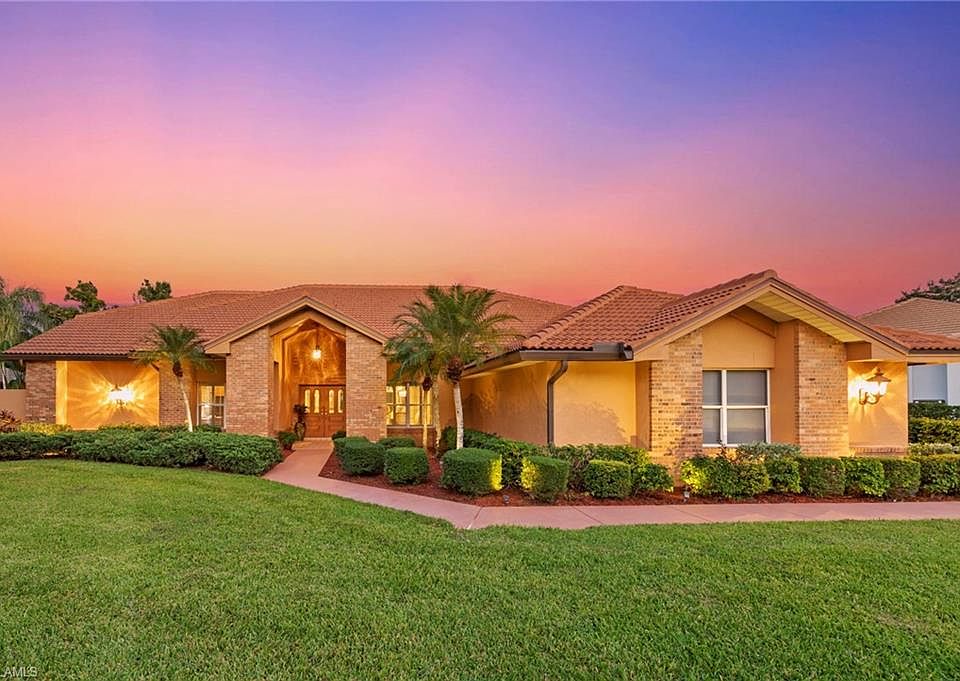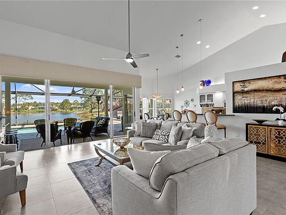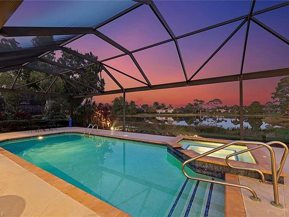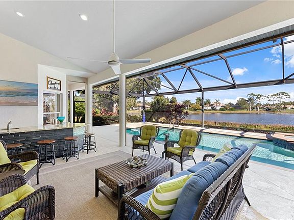 Welcome home to this beautifully maintained 3-bedroom + den, 3-bath residence in Wildcat Run, a private, low-density golf and country club community in the heart of Estero. Set on an oversized lot with a stunning wide water view and desirable Eastern exposure, this 2,755 sq. ft. home offers bright, open living with timeless finishes, a thoughtful 2018 interior remodel, and exceptional outdoor space. Remodeled in 2018, the open floorplan features soaring volume ceilings, custom lighting, an elegant vaulted ceiling, and a versatile den or office. The kitchen includes granite countertops, a tile backsplash, breakfast bar, and a charming breakfast nook overlooking the lake. The primary suite offers lanai access, a large walk-in closet, dual vanities with updated counters and sinks, a Jacuzzi tub, and a floor-to-ceiling tiled walk-in shower. Two guest suites provide comfort and privacy for visitors. Outdoor living shines on the expansive lanai designed to capture the best of Florida living, featuring a heated saltwater pool and spa, a panoramic screen framing the wide lake and golf course view, an outdoor bar, and generous covered space for lounging and dining. Electric roll-down shutters, hurricane screens (2018), and Jandy handheld + WiFi pool/spa controls provide added convenience and peace of mind. Recent improvements include updated pantry cabinetry (2019), landscape updates (2021 & 2023), new gutters (2022), HVAC ductwork (2022), and a new laundry room sink (2024). Additional features include a newer roof (2016), newer A/C (2022), a freshly maintained and painted driveway (2025), and a transferable home warranty available for less than $70/month—offering excellent value and peace of mind for new owners. Wildcat Run is known for its rare ½-acre homesites, custom-built residences, and lush, mature landscaping. Amenities include an Arnold Palmer–designed 18-hole championship course (with no waitlist for golf memberships), tennis, pickleball, bocce, fitness and wellness facilities, and exceptional dining—all minutes from I-75, RSW Airport, Coconut Point, Hertz Arena, and the Gulf beaches. An exceptional opportunity to enjoy refined living, stunning water and golf views, and a premier country club lifestyle in one of Estero’s most desirable communities.