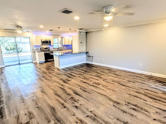 First class renovation done on this open planned, light, bright and cheery home, in Sarasota Springs. This open floor plan is flooded with natural light from abundant and large windows. The kitchen has solid wooden cabinetry, topped with slab granite counters with breakfast bar and pendant lights, custom backsplash, pantry, pass thru window to lanai, wine frig, all complemented with stainless steel appliances and under cabinet lighting. The kitchen is open to dining area and living room for easy family time and entertaining. The master bedroom is on the other side of the home from remaining two bedrooms and is spacious with door to lanai and wall of closets. The en-suite bathroom has dual sinks and walk in shower. NO CARPETING-all water proof vinyl flooring and tile. The lanai is covered and screened with a tranquil view of your fully fenced back yard. There is a two car garage and that is where the full size laundry is. This home is well located, convenient to shopping, dining, good schools, not far from downtown Sarasota and the beach. Call NOW for your next home!