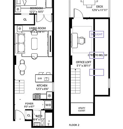 Office loftPrivate roof deckExposed brick wallPeninsula seatingHardwood floorsVaulted ceilingsLarge closet