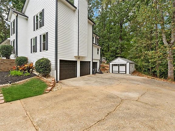 Situated on a quiet, oversized cul-de-sac lot backing up to 20 acres of designated green space, this beautifully renovated home ticks off all the right boxes! Curb appeal abounds as you approach the lush, landscaped property and are welcomed by a wrap-around rocking chair front porch. Step inside to brand new wood flooring leading to a spacious fireside family room featuring built-in bookcases, convenient wet-bar, and plenty of natural light. Separate dining space overlooks the well-appointed kitchen with all the right updates, including a breakfast bar/island with storage space, granite counters, stainless appliances, gas cooktop, recessed and pendant lighting, and additional casual dining space overlooking the back yard deck. The main level also includes a powder room and large guest bedroom with walk-in closet and ensuite bathroom. Upstairs, you will be wowed by the fabulous primary suite, a true private retreat extending the width of the home! Tray ceiling, separate walk-in closets, French doors opening to a flexible room perfect as a nursery, sitting room, or office space, access to a private screened balcony, and a spa-inspired bathroom with dual quartz vanities, separate soaking tub, and frameless tiled shower. A private sauna completes the spa experience! Two secondary bedrooms, a full bath, laundry room, and additional closet space round out the upper level. The basement includes a finished recreation room, workshop, and additional storage space. Parking is never a problem, with three side-entry garages and a separate detached 12x24 shed/garage installed on a concrete pad with architectural roofing and painted to match the home. Relax and entertain with ease on the rear screened porch, deck, and extended brick patio overlooking the private back yard. This home has been meticulously maintained - Recent improvements include new windows, tankless, fully vented water heater, refinished hardwoods upstairs, new garage doors, primary bath updates, two new HVAC systems, new paint and pressure washing, and the septic system has just been serviced with a transferrable warranty. All of this, plus a wonderful location in top-rated Peachtree Ridge schools, and minutes to I-85, shopping, dining and parks. Schedule your private tour today!