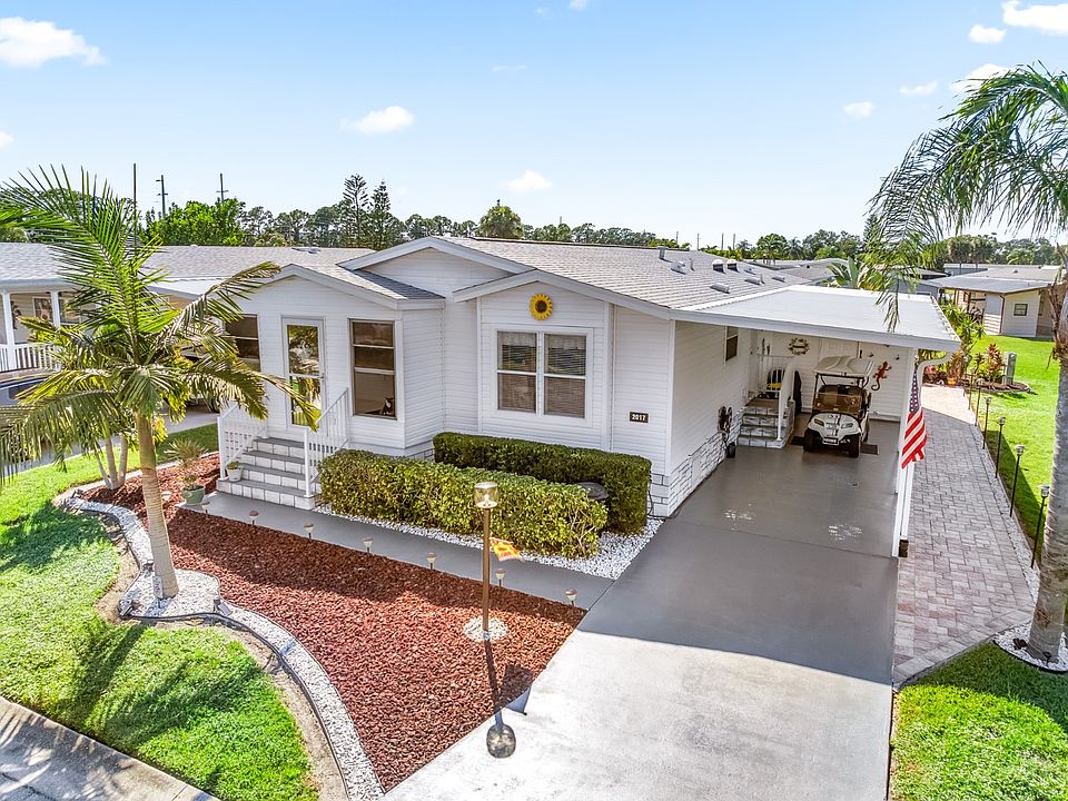 Absolutely stunning home in a prime location-within close walking distance to the pool and just minutes from the front entrance of the community. Recent Upgrades & Features Nearly 1,500 sq. ft. of living space with numerous improvements: New shingle roof and carport roof June 2023, laminate wood flooring throughout, GE electric stack laundry center, 40-gallon hot water heater (2023), and AC ductwork professionally cleaned in 2022. A new Goodman 3.5-ton HVAC system was installed in 2025. Kitchen & Dining The large kitchen offers an abundance of cabinets and counter space, plus a cozy dining area with windows for natural light. An additional counter area can be used as a breakfast bar, wine bar, or serving station. All kitchen appliances stay, including a stainless steel French door refrigerator with icemaker (2022) that still carries a five-year warranty. Barstools are also included. Outdoor Living The landscaping is stunning with lava rock, white gravel, and a beautiful Alexander palm tree in the front garden. Pavers run along the side of the home, leading to a private rear patio with lighting, landscape accents, a patio set with four chairs, and an oversized utility box for storage. Interior Layout Oversized rooms throughout, with high ceilings, extra wide 45 inch hallways and 36 inch wide doorways-all fully handicap accessible. The versatile den/office with French doors can easily serve as a third bedroom with the addition of an armoire. The primary bathroom features a spacious walk-in shower with dual showerheads and two built-in seats. Laundry & Storage The laundry/mudroom is both functional and stylish with a highlighted décor wall and convenient entry. A large 10' x 11' shed provides abundant storage. Unique Entrance The front porch entry is a true highlight-complete with tile flooring, custom shades, ceiling fan, and a heavy-duty storm door. Perfect for relaxing or welcoming guests. Lakes of Melbourne - Premier 55+ Gated Community Lakes of Melbourne offers the perfect balance of activity and relaxation with outstanding amenities, including a recently upgraded clubhouse, resort-style pool, game and hobby rooms, a fitness center, and a full calendar of social events. Ideally located near shopping, dining, hospitals, and just minutes from the pristine beaches of Melbourne and Cape Canaveral, this private gated community provides both convenience and peace of mind. ⸻