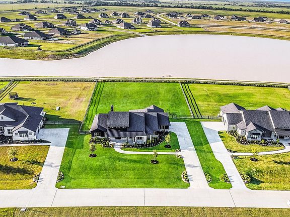 Gorgeous waterfront home in the acreage community of Lakeview. This single story home boasts an expansive open-concept design, 4 bedrooms, 4.5 baths, a 3 car garage, covered outdoor living with a fireplace, and serene views of the 45-acre community lake. Double front doors open to the impressive open living area with 14' ceilings, wood beams, large windows, and wood flooring throughout. The gourmet kitchen is equipped with a large island, abundant cabinet space, stacked upper display cabinets, double ovens, a large walk-in pantry, and beautiful finishes. Just off of the entry is a built-in wet bar with a beverage fridge and ice maker - ideal for entertaining. The private owner’s suite features a spa-like bath with a freestanding tub, oversized shower, and generous walk-in closet. A dedicated home office is enclosed by French doors. The guest bedrooms all have en-suite baths and walk-in closets. Huge, fenced backyard overlooks the lake. Don't miss this spectacular home!