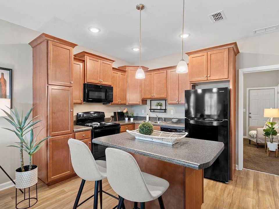 Kitchen islandWood-look flooringWindow blindsFull appliance packageMaster bedroom suite downstairs