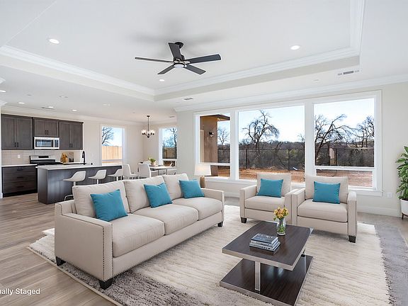 Newly Constructed Home On Scenic Greenbelt Lot With Breathtaking Views Of The Rolling Hills. 1780sf 4 bed/ 2 bath home features a split floor plan with a spacious open layout and abundant natural light streaming through large picture windows. The kitchen offers custom-built cabinets with soft-close features, 3 cm quartz countertops, tile backsplash, large island, stainless steel appliance package and a walk-in pantry. Baths include quartz countertops, tile surrounds, dual vanity in owners suite and spacious walk-in closet. Additional features include: owned solar, exterior stone package, fully landscaped front yard & RV parking. Don't miss this opportunity to own a quality built home by Ridgeline Builders!