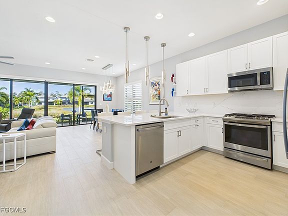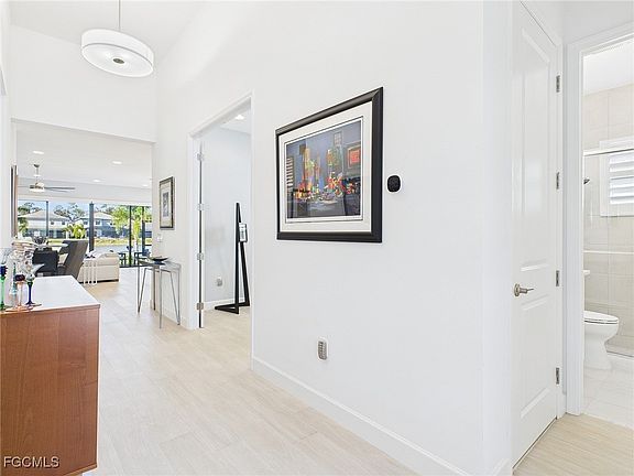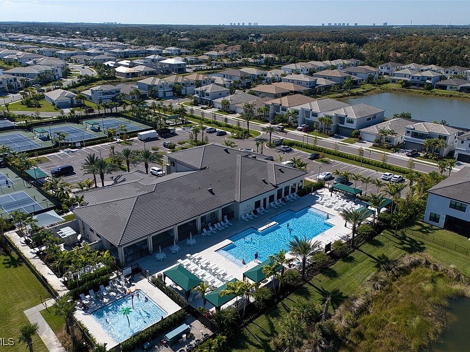 Welcome to this stunning lakefront home, built in December 2023 by award-winning GL Homes, located in the highly sought-after Corkscrew Corridor. This single-story residence offers 3 bedrooms + den (or optional 4th bedroom), 3 bathrooms, Impact-resistant windows and doors for peace of mind and provides 2,135 sq. ft. of living space with a 2-car garage. Designer upgrades throughout: new high-end lighting, fans, and plantation shutters, fresh interior paint and tile plank flooring for a modern, cohesive look. Quartz countertops make the chefs kitchen a delight along with 42" white shaker cabinets and stainless-steel appliances. Natural gas house w/oven, dryer, and hot water heater for efficiency and performance. Volume ceilings and tall doorways create an open, airy feel, new Kohler toilets, master bath fixtures, and frameless shower door. Custom closet cabinet systems and remote-control solar shades in the living room. New epoxy garage floor for durability and style, tile roof, paver driveway and screened lanai with mounted 55" Smart TV. New landscaping enhances curb appeal. Ring-style Doorbell and Security System. Community & Amenities (opened in December 2024): Located in a gated community of only 554 homes. Residents enjoy low HOA fees and an unmatched amenity package: 12,000 sq. ft. clubhouse with indoor sports complex (basketball, fitness, yoga, billiards, card/game room, catering kitchen, lounge, meeting room). Resort-style pool w/ Cabanas, 6 lighted pickleball courts, 4 lighted tennis courts, bocce ball, outdoor basketball, playground, splash park, firepit, picnic area & sidewalks throughout for easy access to amenities, lawn care, irrigation, exterior pest control, and 24/7 security included. This home combines luxury finishes, modern convenience, and resort-style living in one of Southwest Florida’s most desirable locations close to: Miromar Outlets, Coconut Point, University Village, Gulf Town Center, Florida Gulf Coast University, Lee Health Hospital, Public Golf Courses, Estero Park & Sports Complex, Walking Trails & Bike Paths. RSW AIRPORT & I-75 are just minutes away for easy access to the BAREFOOT BEACH, Fort Myers Beach, LOVER'S KEY and all that NAPLES has to offer! This is the perfect Primary and Vacation Residence or as a Seasonal or Annual Rental for Investors (no waiting period)! Pet Friendly (no weight or number of pets restrictions)!