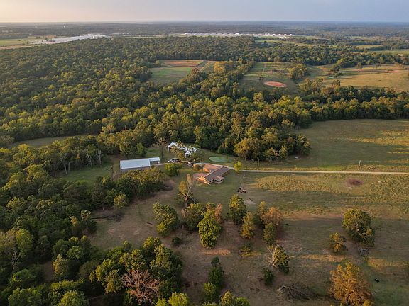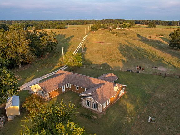 Legends Trail - A 2017 custom estate with 3,180 sq. ft. of luxury living, chef's kitchen, game rooms, and spa-style master suite. Ranch amenities include 6 ponds, a spring, pipe fencing, cattle facilities, and two large barns with RV storage, stalls, kennels, and an apartment. Wildlife, pastures, and mature timber complete this one-of-a-kind property. The land is equally impressive, offering a mix of open pasture and mature timber. The property has beautiful water features with six ponds, a creek, and a remarkable year-round spring that comes out of the hillside in multiple places. Additionally, pipe fencing, freeze-proof waterers, and a large working cattle facility together make the property fully equipped for livestock. Wildlife is abundant, with whitetail deer, turkey, and quail thriving in the managed habitat. Two large barns support both agricultural and recreational use-one 40'x100' hay barn with RV storage and 50-amp service, and one 60'x80' insulated barn with stalls, kennels, and a finished apartment. With a gated entrance and pavement frontage, Legends Trail is turnkey for both everyday ranch living and weekend retreat enjoyment. Land Mixture of open pasture and mature walnut timber 2 main pastures, 3 working pens, large cattle facility with pipe fencing and weaning pens 6 ponds, wet-weather creek, and year-round spring Multiple freeze-proof livestock waterers (with additional location prepped) Fertilized and maintained pastures for cattle and hay production Excellent hunting with deer, turkey, and quail Inside the home, you'll find hardwood floors throughout, a spacious great room with a wood-burning rock fireplace, game and TV rooms, and a whole-home stereo system. The gourmet kitchen is a centerpiece, featuring knotty alder cabinets, granite countertops, a 6.5' x 5' island with farm sink, under-cabinet lighting, propane cook stove, 48" refrigerator, trash compactor, and a large walk-in pantry. The master suite includes a huge bedroom, oversized walk-in closet, and a spa-inspired bath with soaking tub, double vanity, and tiled walk-in shower. Additional highlights include a central vacuum system, granite-appointed bathrooms, and a large laundry room with sink and storage. The back patio extends living space outdoors with stained concrete, cedar car siding ceiling, built-in stereo, and a relaxing hot tub. Durable smart siding, Anderson windows, and stone accents give the home a maintenance-free exterior. A 600' deep well supplies excellent water. Key Features: Home Custom-built in 2017 with 3,180 sq. ft. living space (4,000 sq. ft. under roof) 3 bedrooms, 2 bathrooms Hardwood floors throughout, wood-burning rock fireplace Game room, TV room, whole-home stereo system Chef's kitchen with knotty alder cabinets, granite countertops, and large 6.5' x 5' island 36" propane cook stove, 48" refrigerator, farm sink, trash compactor Spacious master suite with walk-in closet and spa bath (soaking tub + walk-in shower) Central vacuum system with multiple ports Oversized laundry room with sink, granite, and storage Back patio with hot tub, cedar ceiling, stained concrete, and outdoor stereo Low-maintenance smart siding, Anderson windows, stone accents **Two Custom light fixtures/fans in the bedrooms will be excluded from the sale.** Barns & Improvements Barn #1 (40'x100' built 2019): 16' side walls, RV storage with 50-amp service, 3 oversized doors, hay storage for 180 round bales Barn #2 (60'x80' built 2012): Fully insulated with horse stalls, dog kennels, and attached apartment with A/C Gated entrance with paved frontage