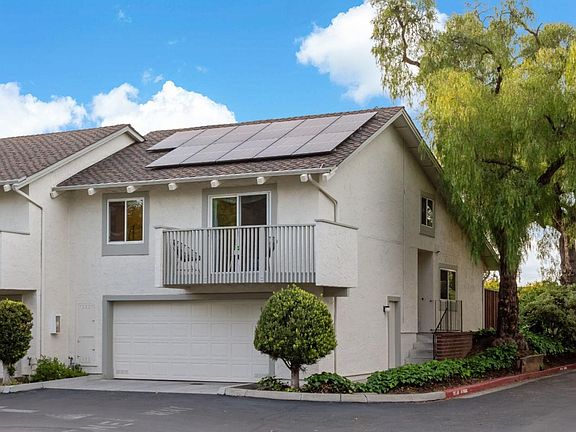 This home has features that renovation can't provide. Enjoy the feeling of a HOME for relaxation. Abundance of natural lights from the patio & the vaulted ceiling. From LR, views from distant tall green trees. From kitchen & loft windows, views of swaying green leaves. From 2nd BR, view of leaves. Lots of Privacy! Unlike most middle units, private entry w/o sharing fence with neighbors. Oversized garage has room to add shelvings along the wall. Unit is situated at the cul-de-sac. While enjoying the roses from the paved patio, don't miss to look into the wall-to-ceiling mirror at the vaulted ceiling dining area. Spacious! With the 260+/- sf. permitted loft addition, this original 1142+/- sf end unit. This home comes with solar panels & EV charger. Laminated wood flooring, remodeled kitchen with sliding drawers. Den behind the LR can be enclosed to form a room. Multi-purpose loft has a folding door. Loft skylights have open/shut shades. Remodeled main bedroom & bathroom. Organizer & drawers in the large closet. Easy, access in & out the community w/o driving through speed bumps. Amenities incl. 3 swimming pools, one is a lap pool, fully equipped gyms, sauna, jacuzzi, clubhouse & more. Easy access to grocery, freeway, schools & restaurants.