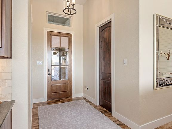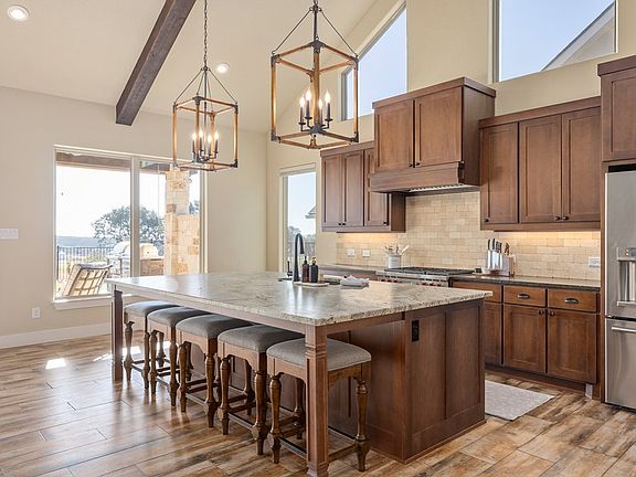 Stone fireplaceOpen floor planLeathered graniteWine fridgeLarge covered back patioWood interior doorsOversized kitchen island