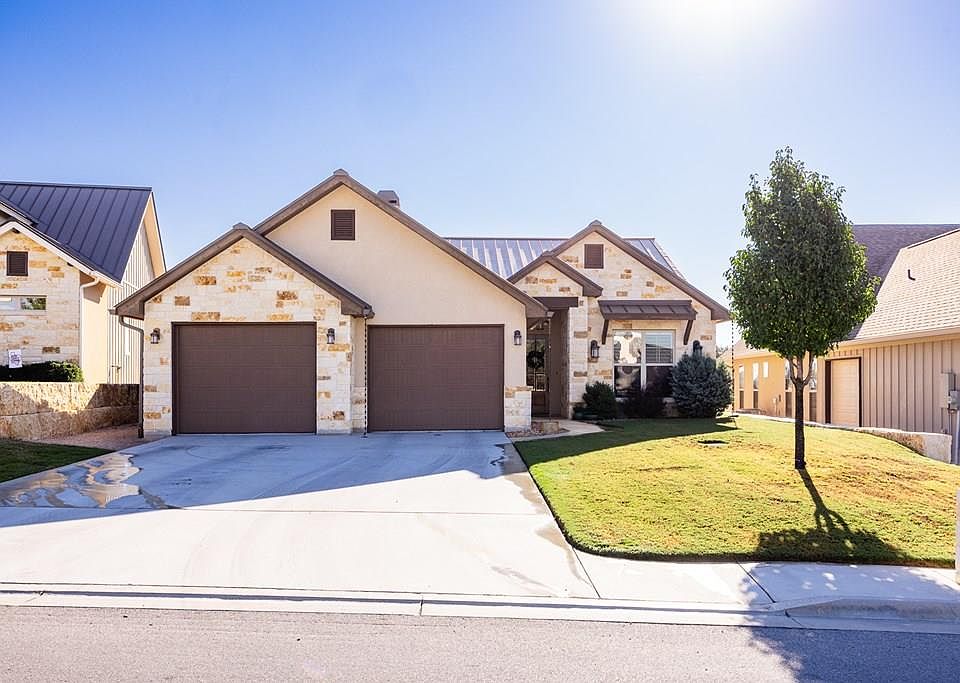 Spectacular garden home with amazing views of Comanche Trace Club House, golf course, practice facility and surrounding hill country. Enjoy SE breezes off the large covered back patio. Interior features include open floor plan with vaulted ceiling with beams, stone fireplace, stone accent wall, wood interior doors, Wolf 6 burner commercial gas range with double oven, leathered granite, oversized kitchen island, walk-in pantry, wine fridge, dog washing station in laundry room, tile floors throughout, walk-in showers, 2 1/2 car garage with separate door for golf cart, remote shades and plantation shutters. This home is practically brand new! Yard maintenance is included for a separate fee. Comanche Trace is a master-planned golf community with many amenities including private Guadalupe River park, 3 1/2 miles of crushed granite walking trails, stocked fishing lake, community garden and more! Golf and Social Memberships are available for a separate fee. Come for the views and stay for the lifestyle!