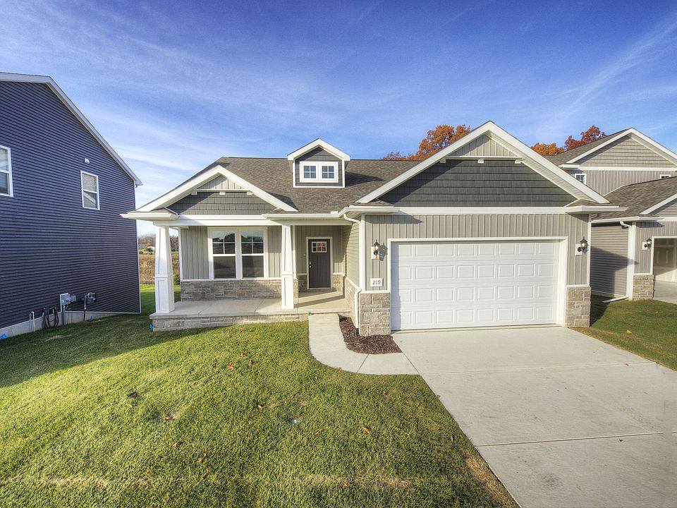 This remarkable single-story 2 bedroom, 2 bathroom Ranch Style Home offers the perfect blend of comfort and style, providing an excellent alternative to a condominium. This open concept design seamlessly integrates the living and dining areas, creating an expansive and inviting atmosphere. The vaulted ceilings add a touch of elegance and enhance the sense of spaciousness. Impressive kitchen featuring a center island, soft-close cabinetry, stunning counter-tops and an ideal setting for entertaining and everyday cooking. The convenience of a first-floor laundry ensures practicality and ease of use right off the garage and mudroom. The master suite boasts a generously sized walk-in closet to accommodate all your wardrobe needs. The master bathroom exudes luxury with its dual comfort height vanities and tiled shower, offering a truly indulgent experience. Wide doorways and laminate flooring in the main living areas provide an added touch of convenience and accessibility. The full basement, featuring 9' ceilings and Superior basement walls. This remarkable home comes equipped with a garage door opener and a fully dry-walled garage. The inclusion of life-proof laminate flooring and ADA compliant doorways further enhances the functionality and accessibility of the home. STOCK PHOTOS