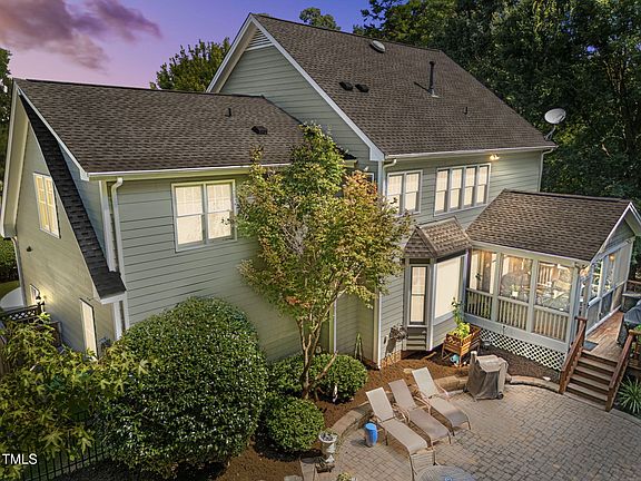 Welcome to 2018 Stoneyridge Drive, a custom-built home by Homes by Odell Thompson that showcases exceptional craftsmanship and timeless details. Nestled on a .39-acre beautifully landscaped cul-de-sac lot, this 4-bedroom, 3 full and 2 half bath home offers 2,816 heated square feet plus 849 square feet of walk-up storage for future expansion. Beautiful hardwood floors and crown molding carry throughout the main level. A bright foyer opens to a home office with glass French doors, transom, and a custom distressed wood accent wall. Opposite, the dining room with transom entry features a tray ceiling, crown molding, wainscoting, and built-in speakers. The spacious kitchen is a chef's delight with custom white cabinetry, crown detail, light rail, under-cabinet lighting, tile backsplash, dark granite counters, and a center island with updated pendant lighting. Stainless steel appliances include a GE Profile gas range/oven, built-in GE microwave, and dishwasher. A breakfast nook with bay window and built-in desk overlooks the paverstone patio, aluminum-fenced backyard, and lush landscaping. In the back hallway, a built-in hall tree with bench and storage leads to the back staircase and garage entry. The inviting family room features a gas-log fireplace with custom painted mantel and built-ins, flanked by square port windows, plus built-in speakers. Step onto the screened porch with vaulted stained ceiling, stained flooring, painted railings, and built-in speakers—or out to the grilling deck and stone paver patio. Upstairs, the owner's suite impresses with crown molding, wooded views, and a spa-style bath featuring vaulted ceilings, dual vanity, jetted tub, tiled walk-in shower, and walk-in closet. Two bedrooms share a Jack & Jill bath, a fourth bedroom enjoys the hall bath, and a large bonus room provides a great gathering space for friends and family. Additional highlights include a security system, new roof (2019), and exterior paint (2022). The Greenway Club @ Falls River is available for an optional membership, offering a clubhouse, pool, tennis, pickleball, trails, and playgrounds. Enjoy the convenience of being within walking distance to shops and dining, and just minutes from I-540. Don't miss this Oakcroft gem—schedule your showing today!