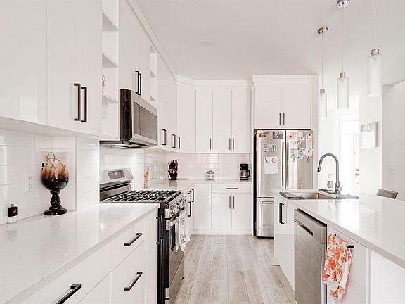 Open-concept layoutHigh ceilingsAbundant natural lightContemporary kitchenStainless steel appliancesQuartz countertopsDining space