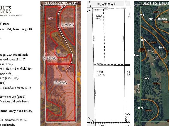 PRICED REDUCED! Welcome to your private retreat of 32 Lush Acres of Vineyard potential land in the Dundee Hills AVA. (See attached Vineyard evaluation) This property has Jory soils and elevations of 360 to 550 feet. Loads of options for whatever dreams you bring with you or have yet to dream!! Property has a 1972 Ranch Home with Multiple barns, tractor sheds, and outbuildings. Fencing & cross fencing. Stunning views from every room of forest, mountain, hillside, and valley. House is a 3 bedroom, 1 ½ bath home with laminate flooring, large family room with fireplace, enclosed sunporch, and extensive patios. Beautiful Oak cupboards with pull out shelves and a breakfast bar in the kitchen/dining area opens onto the sunporch. You will be COMFORTABLE no matter the weather. Plus a fireplace for those winter days that you want to be extra cozy. Beautiful forests to explore. Take your morning coffee out to your viewing deck for a magical sunrise over the valley, and enjoy the beauty of four distinct seasons. Even on a rainy day you are met with the magic of misty mountains. Surround yourself with peace and stunning views, but only 15 minutes to everything you need. 5 minutes to tasting rooms and vineyards. Immerse yourself in the heart of wine country and real farm to table living. A MUST SEE Magical Place!!